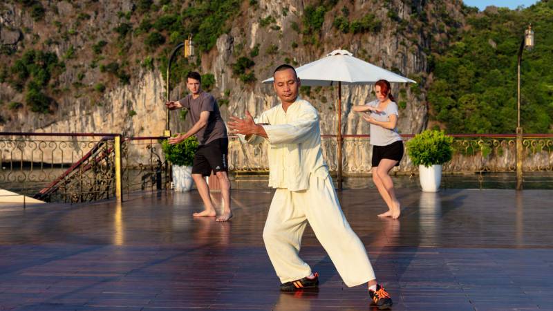 | DAY TWO (Tai chi – Breakfast – Maze Cave – Cua Van Floating Village – Lunch Pearl Farm – Dinner – Free time for activities) |