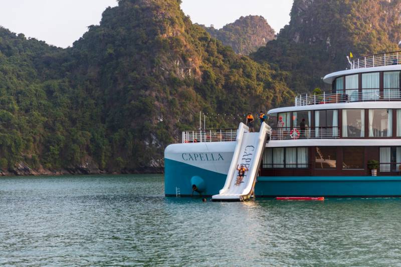 13:00 HAPPY LUNCH Lunch served at Harmony of the Sea Restaurant. As the cruise departs towards Lan Ha Bay, absorb yourself in the beautiful scenery with amazing limestone surroundings. 15:15 - 17:00 ACTIVITIES Cruise anchors at Frog Lagoon area for outdoor activities. Access to Capella’s high-grade entertainment facilities: Infinity Oasis Pool and Jacuzzi; Inflatable Water Slide; Kayak; SUP, Mini-golf etc.