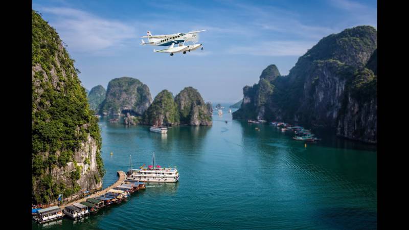Travel from Hai Phong or Hanoi airport to Halong bay, you will pleasure your Halong Bay trip on luxury Paradise Elegance cruise and have 25 minutes scenic by seaplane from Tuan Chau Island. It will be the best choice for Halong Bay journey both by luxury overnight cruise and from high seaplane to catch the panoramic view of limestone islands and islets.